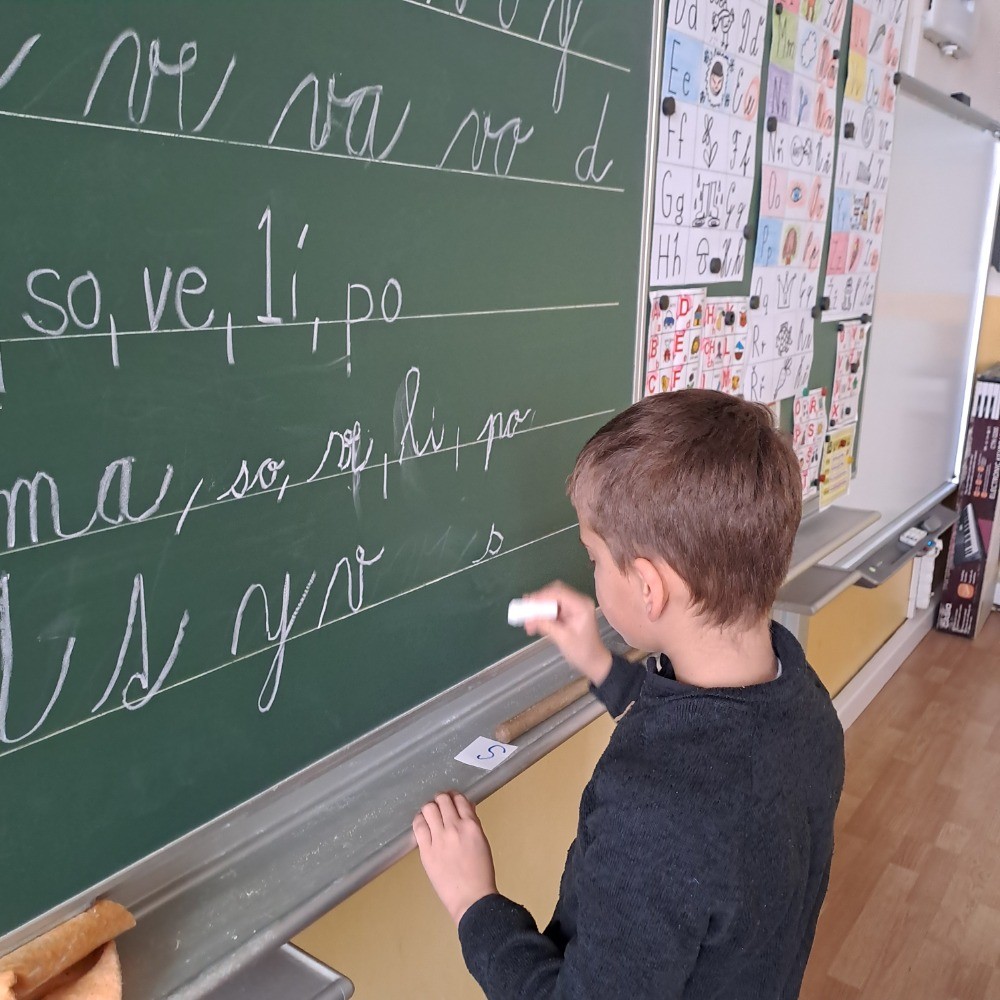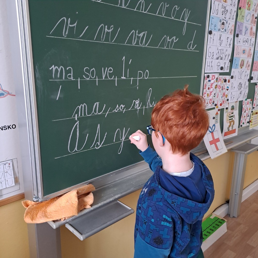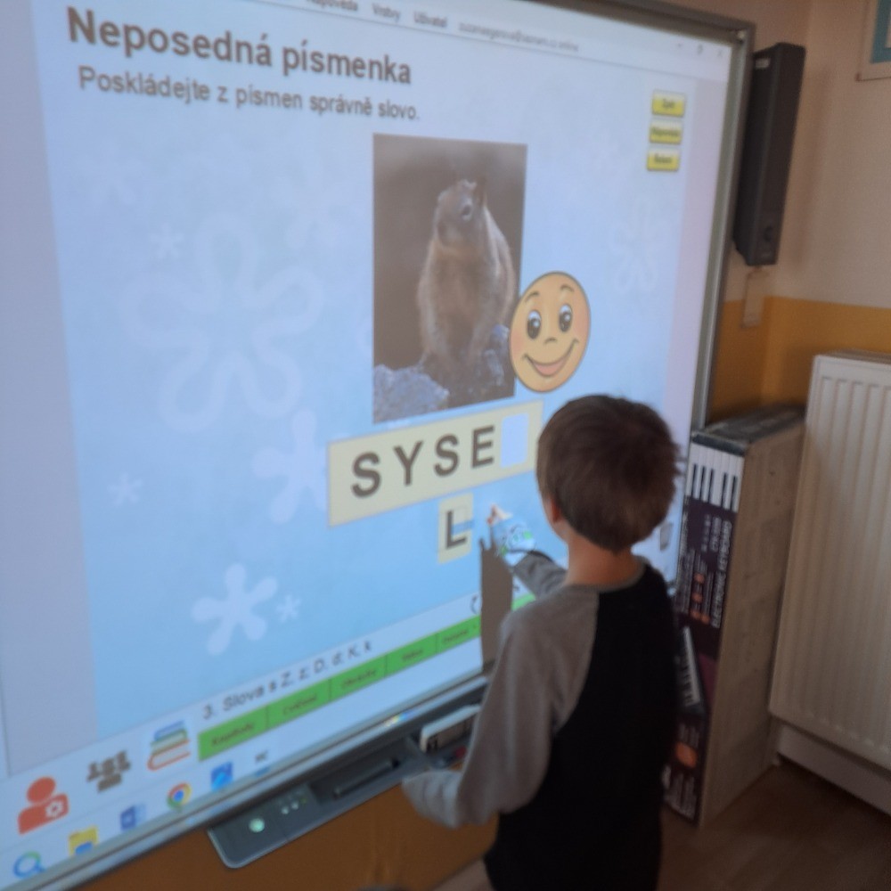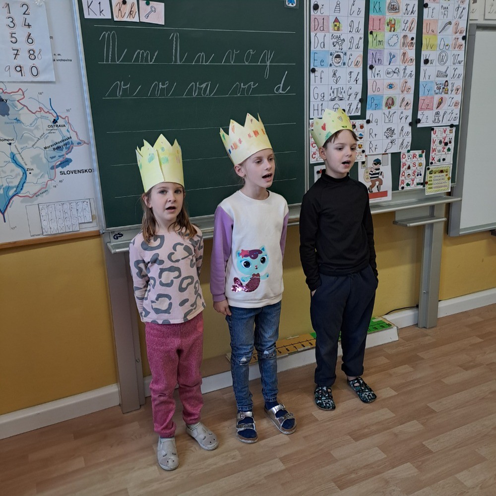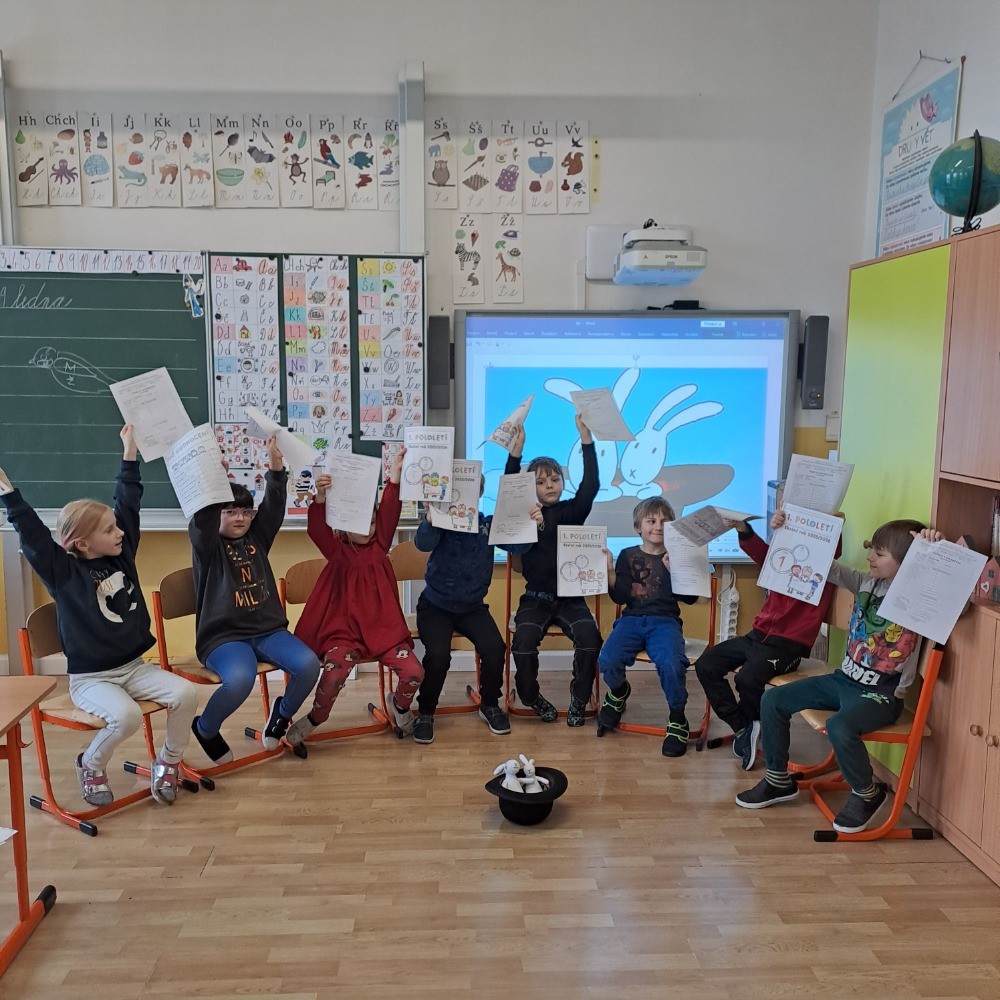 Písmenka na tabuli jsou z poloviny vybarvená. Trénujeme opis a přepis slov, zvládáme i diktáty písmen a slabik. V matematice jsme začali počítat od deseti do dvaceti s penězi, kostkami i s čísly. Skvělé bylo bruslení v hodinách tělocviku, které se nám hodilo k povídání o bezpečnosti a zimních sportech v prvouce. Dramatizujeme písničky. V závěru ledna nás čekalo první vysvědčení a pololetní prázdniny!